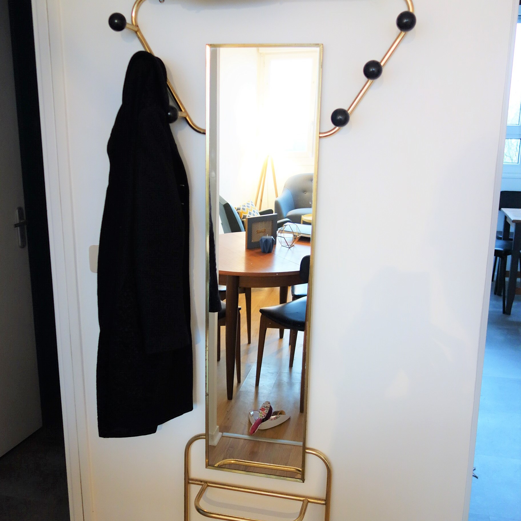 Cet appartement de centre ville nantais avait un fort potentiel et ressemblait à une coquille vide. A moi de proposer du style et une harmonie pour les pièces de l’appartement. L’entrée donne désormais le ton avec ses peintures graphiques et son porte manteau en cuivre. A l’intérieur de l’appartement, la mission prioritaire a été de créer une cuisine et de redonner du confort à la salle de bain. Dans la salle d’eau, une douche ouverte a été priorisé. Un mur graphique vient donner du dynamisme.
