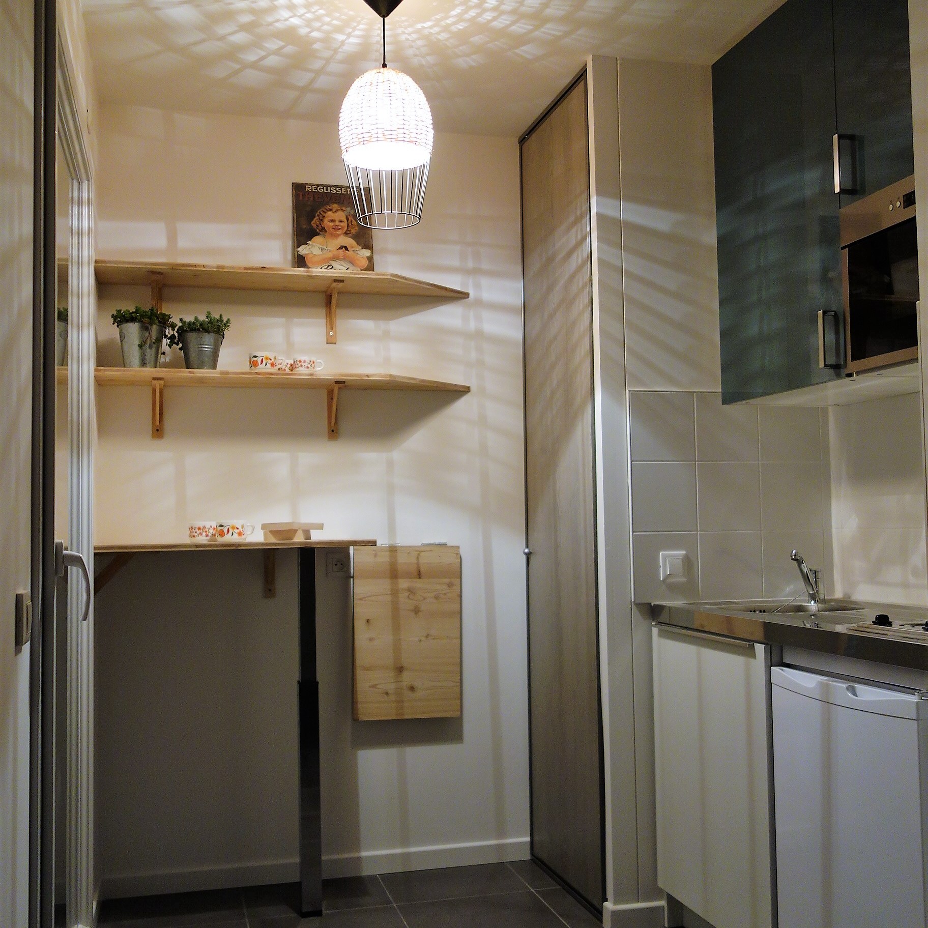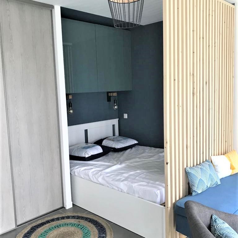 Cet appartement de centre-ville nantais flambant neuf a été aménagé juste après sa livraison. Le propriétaire voulait le meubler sur mesure afin que son locataire n’ait plus qu’à y poser sa valise ! L’entrée a été marqué avec un papier peint imprimé dans les coloris bleus choisi pour l’appartement. Un placard existant a été partiellement démonté pour le rétrécir et ainsi pouvoir créer une alcôve pour y installer le coin nuit.